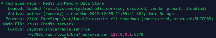 레디스가 정상적으로 실행되면 systemctl status redis 명령을 실행했을 때, Active : active (running)로 표시가 된다.