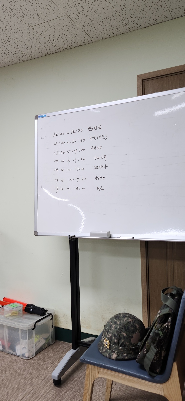 12:00 ~ 12:30 : 도착한 사람들 확인을 하고 신분증을 수거하며 점심값으로 8000원을 지급해주며 출석 체크를 함. 출석 체크가 끝난 후 남은 시간이 있으면 오늘 있을 훈련에 대한 간략한 내용을 알려준 후, 식사를 시작함.