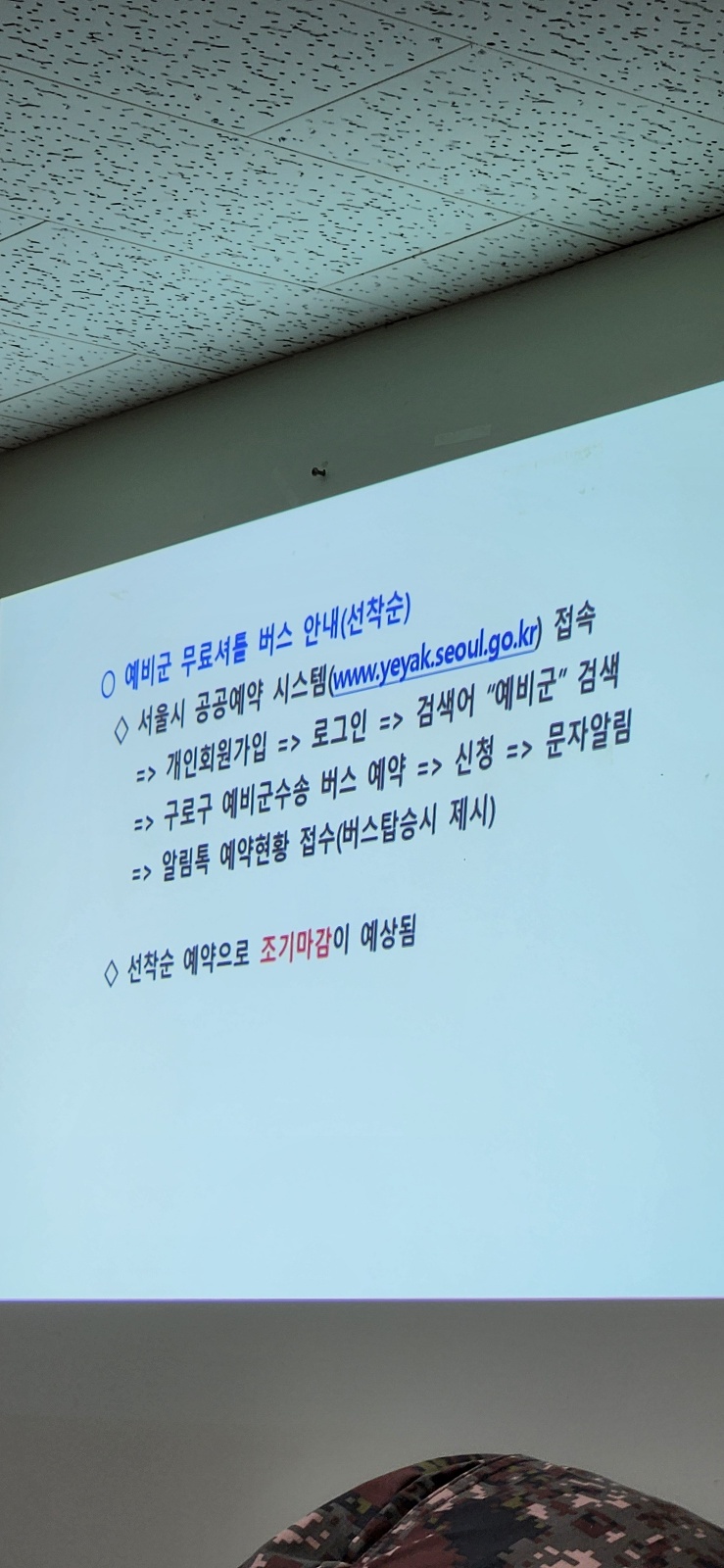 - 예비군 훈련 환경이 상당히 열악함. 빔 프로젝트도 작은거 쓰고 좁은 강당에서 진행됨