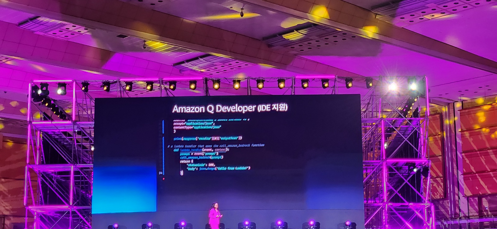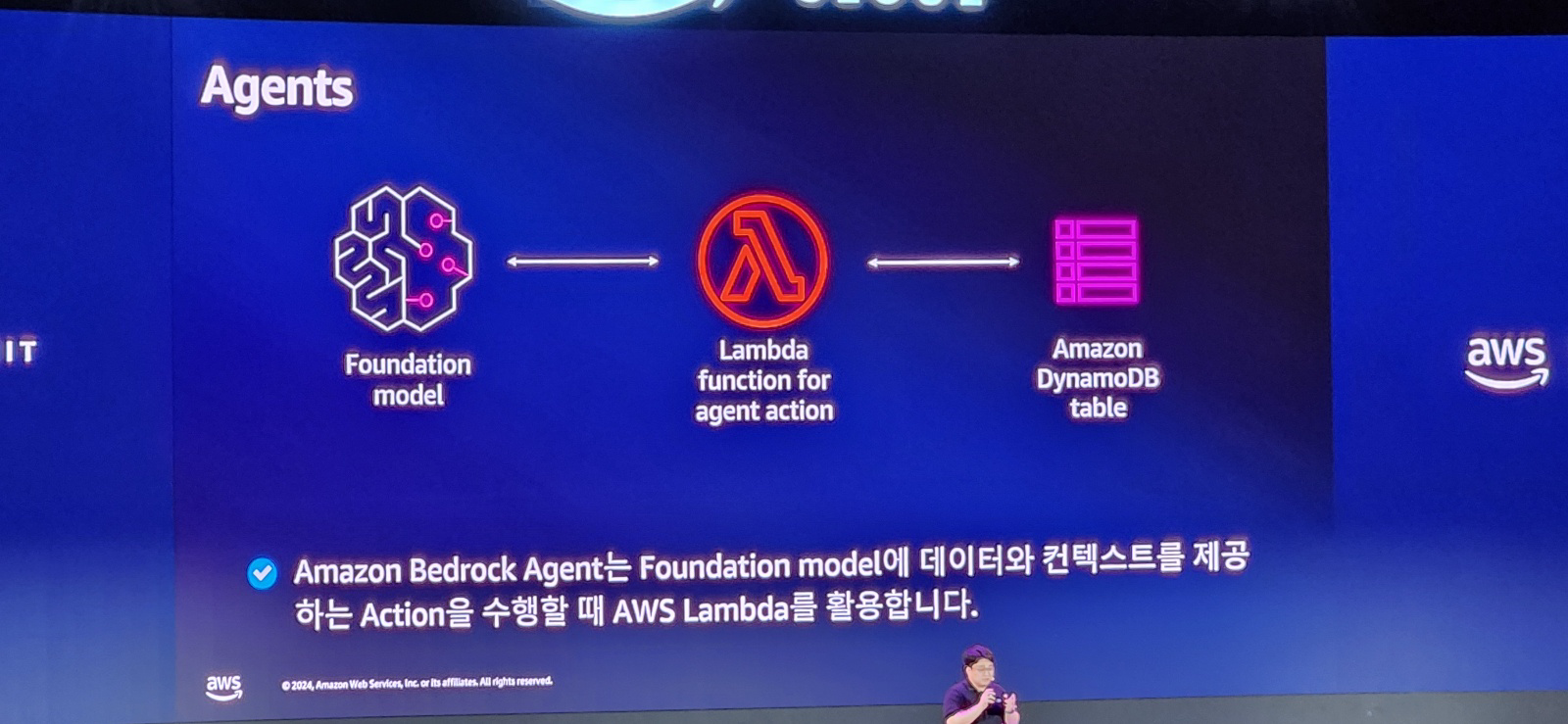 9시 30분 ~ 10시 40분 동안 기조연설을 진행하는데 요번 기조 연설은 주로 AI 관련 내용을 담고 있다. 최근에 새로 출시한 AWS Bedrock과 AWS Q에 중심적으로 설명했다. 생성형 AI가 관심도가 높다보니 주로 설명한 것 같다.