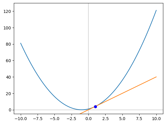 결과값이 유사하게 나왔으며 1에 극한한다는 것을 고려하면 $ y = x^2 + 2x + 1 $ 방정식에서 x가 1일때 미분값은 4가 된다.