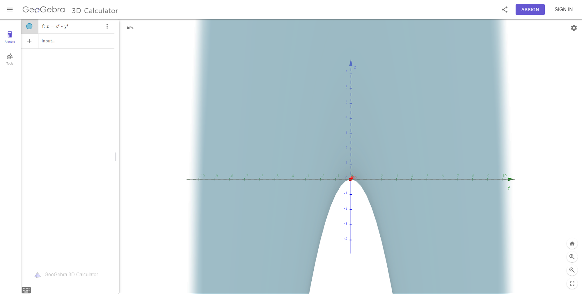 시각화할 방정식 $ z = x^2 - y^2 $ 를 써넣으면 위와 같은 그래프가 나타나게 된다. 그래프를 돌려 확인하면 z >0 부분은 아래로 볼록한 포물선, z< 0 부분은 위로 볼록한 포물선이 있다.