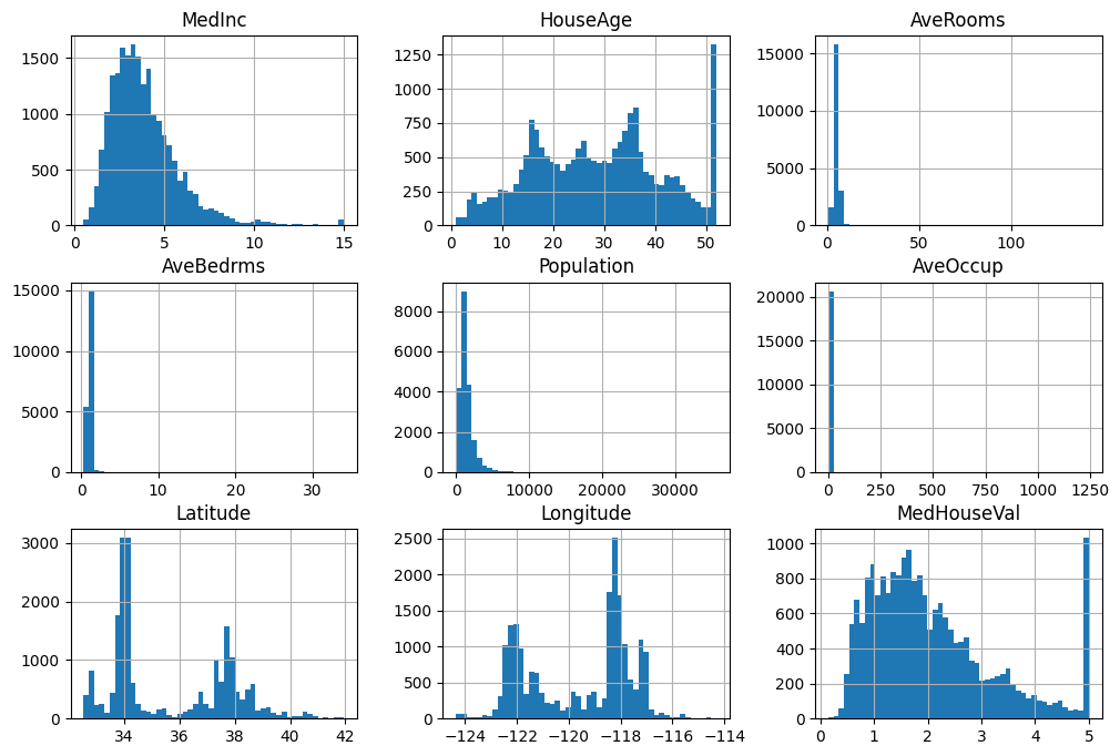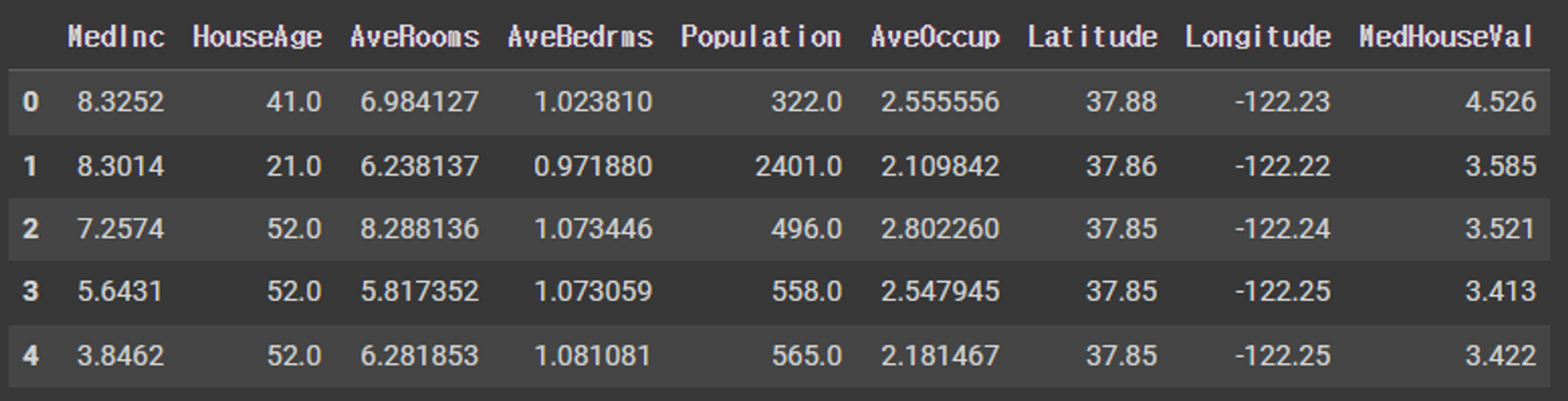 frame, head()를 활용하여 상위 5개 행의 데이터가 출력되며 이 표를 통해 데이터의 특성과 대략적인 데이터를 알 수 있다. 데이터 특성의 종류는 MedInc(중위 소득), Housing Age(주택 연식), AveRooms(평균 방 개수), AveBedrms(평균 침실 수), Population(인구 수), AveOccup(평균 거주자 수), Latitude(위도), Longitude(경도)로 총 8개의 특성을 가지고 있다.