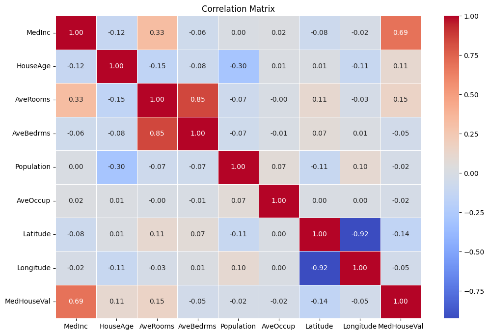 히트맵을 보면 MedInc(중위 소득)와 MedHouseVal(한 구역 내의 주택 중앙값)이 0.69로 표시되며 높은 상관 관계를 가진 것을 확인할 수 있다. AveRooms와 AveBedrms는 0.85로 더 높은 상관 관계를 가지고 있지만 이 모델의 목표 변수는 MedHouseVal이기 때문에 MedHouseVal과의 상관 관계를 비교해야 한다.
