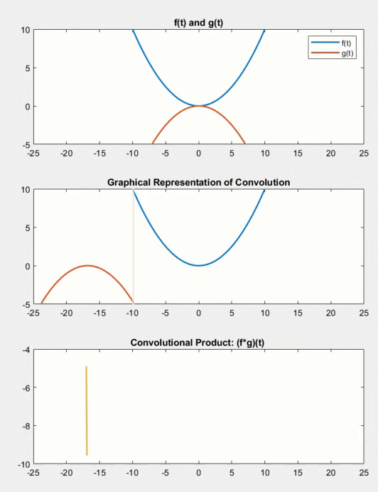- 슬라이딩: $ g(x) $를 $ f(x) $ 위에서 왼쪽에서 오른쪽 방향으로 조금씩 이동한다. 이동하면서 겹치는 부분이 있으면 겹치는 부분의 값을 곱하고 더한다. 마지막 부분에 도달할 때까지 반복한다.