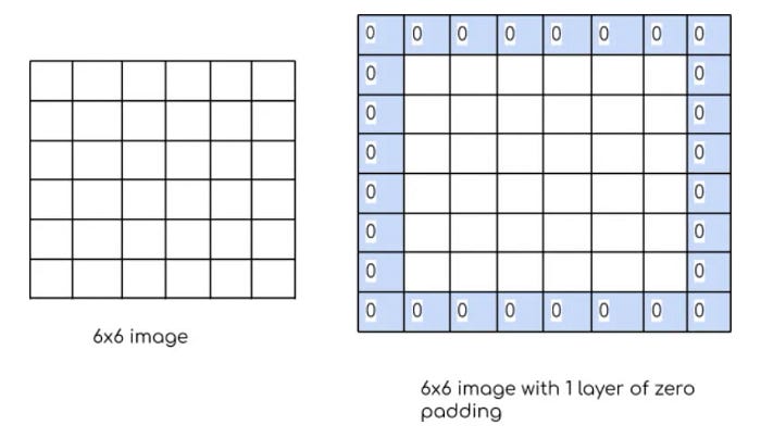 위의 예제를 바탕으로 입력 이미지를 5 x 5, 필터를 3 x 3으로 하면 특성맵은 3 x 3으로 가로, 세로 2픽셀이 줄어든다. 하지만 패딩(padding)을 적용하면 특성맵의 크기가 줄어들지 않고 입력 이미지와 같은 비율로 출력이 되게 할 수 있다. 즉, 패딩을 적용하면 입력 이미지 5 x 5와 동일한 크기의 특성맵을 추출할 수 있다. 즉 입력 이미지 가장자리에 값을 추가로 채워넣는 작업을 의미하며 패딩을 적용한만큼 이미지가 커지기 때문에 특성 맵의 크기를 조정할 수 있게된다.