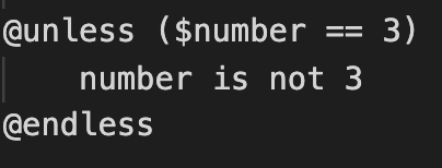 추가적으로 @unless란 조건문도 제공한다. 이 조건문은 선언한 조건이 일치하지 않을 때 실행되는 구문이다. 이 경우에는, number변수가 3이 아닌 경우에 number is not 3라는 결과값이 나오게 되는 것이다.