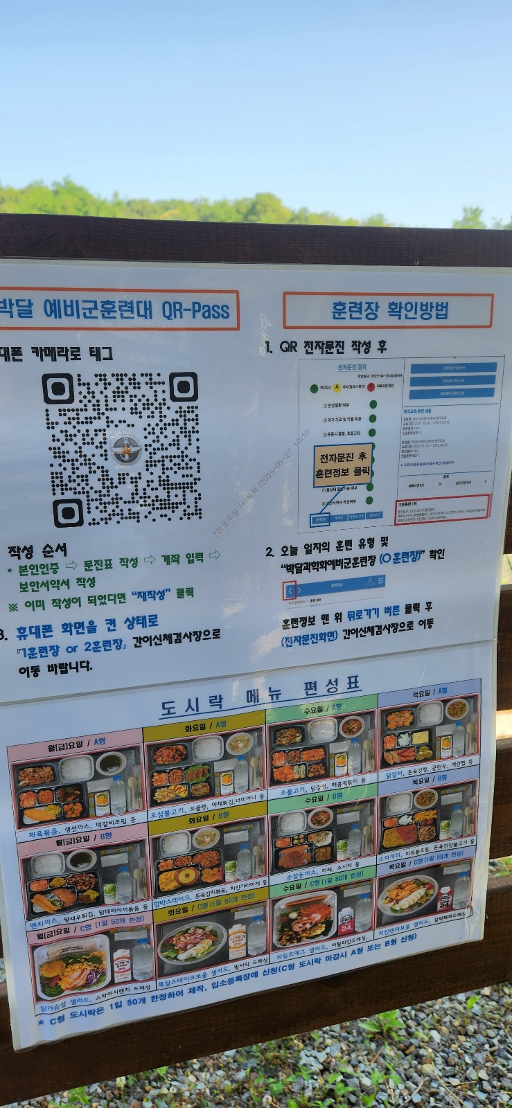 12:10 ~ 14:00 - 점심 시간. 점심 배식은 12시 30분부터인데 남은 교육이 야지전술과 제2 안보교육이라 식당 앞에서 도시락을 기다림. 좌측이 A, C형 도시락이고 우측이 B형 도시락이다. 식당 입장을 기다릴 때 A, C형이면 그늘도 없는 곳에서 줄 서있어야 한다. B형쪽은 그늘진 곳이 있어서 어느정도 시원하게 기다릴 수 있다(본인은 A형이였다. 한식이 좋아서) 점심을 빠르게 먹으면 PX를 이용할 수 있는데 꼭 점심 시간이 아니라 3시 30분까지 PX 입장이 가능함으로 점심 시간에 무리해서 기다릴 필요는 없다.