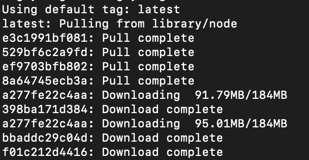 docker pull node를 통해 최신버전의 노드 이미지를 가져오는 모습이다. 이런식으로 이미지를 여러개 받아온 후, 하나의 컨테이너로 통합할 수 있게 된다.