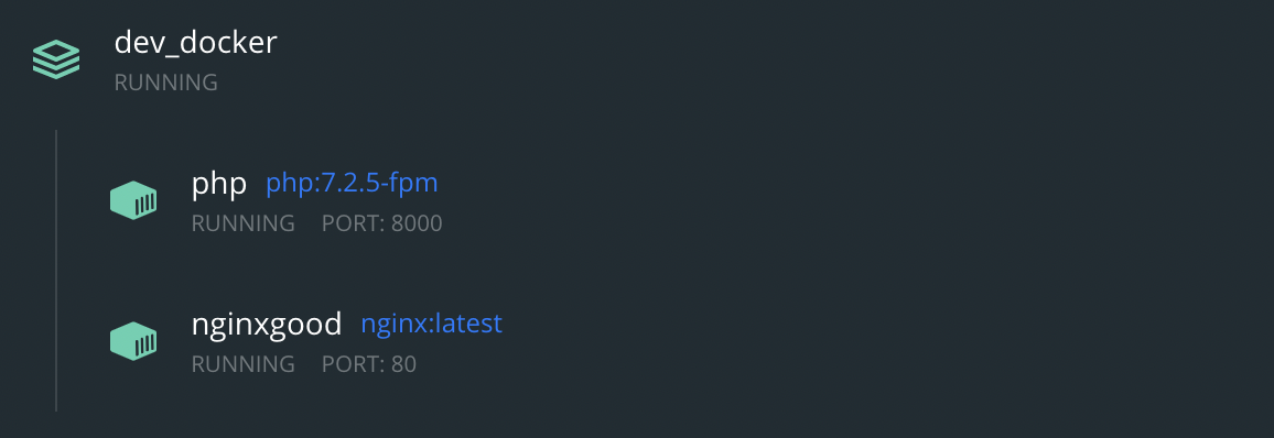 각각의 컨테이너 이름을 php, nginxgood으로 정의하였다. 컴포즈 파일을 정의하여 올렸을 경우, 하나의 큰 틀 안에 php, nginxgood이라는 이름으로 정의된 컨테이너들이 존재한다는 것을 확인할 수 있다.