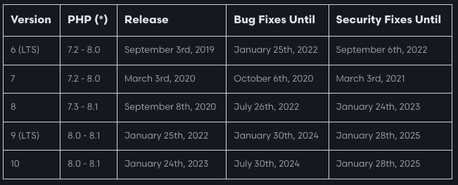 조만간 라라벨 9 버전이 출시되며 LTS버전으로 지정될 예정이다.